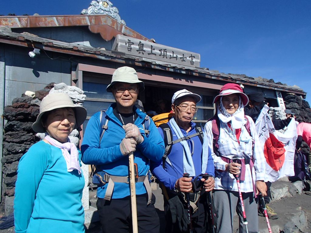 登山/御来光山荘発1:00〜池田館(八合目)4:25〜頂上(浅間大社) 6:20-朝食休憩7:00頃迄〜(御鉢巡り)〜久須志神社8:15〜御殿場ルート下山口8:45-9:10〜砂走館(七合五勺)10:45〜宝永山11:30〜雲海荘(六合目)12:40〜 富士宮口五合目着13:00