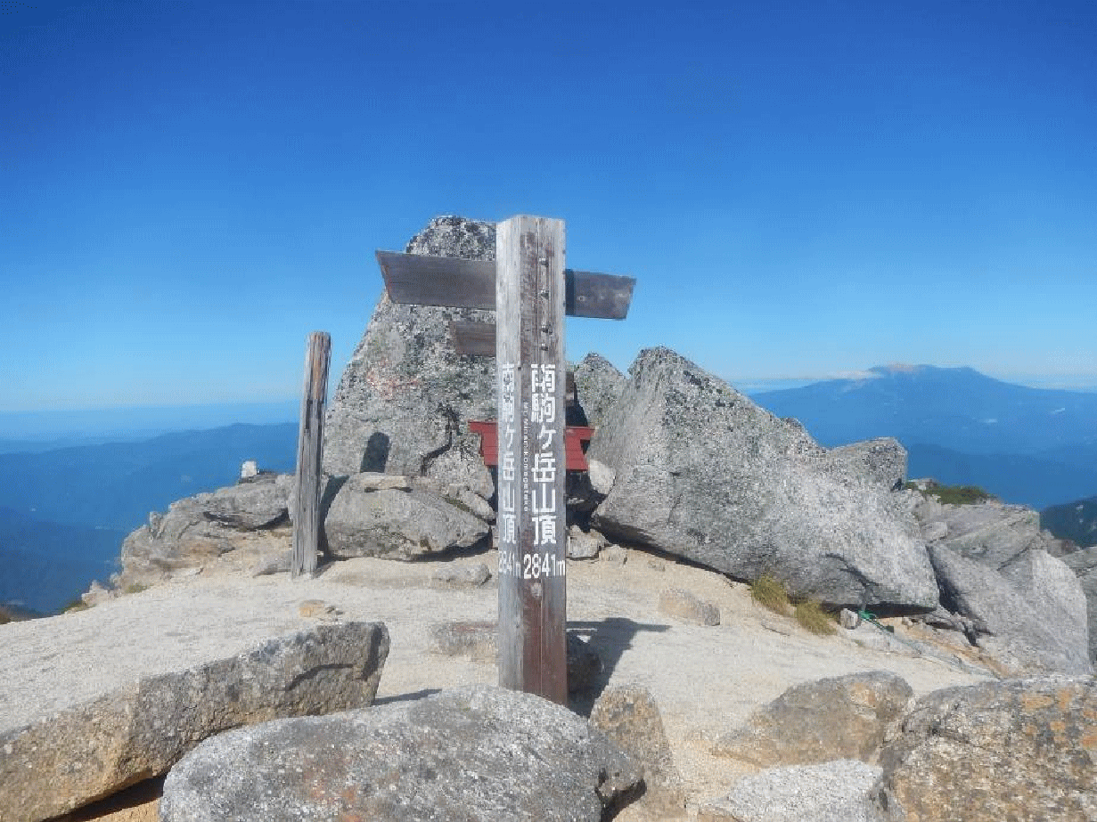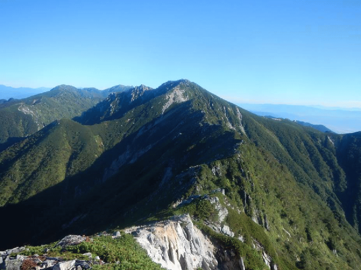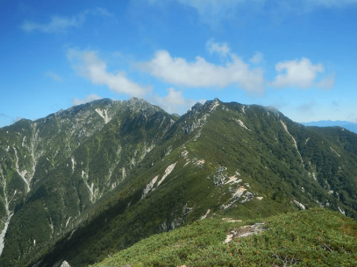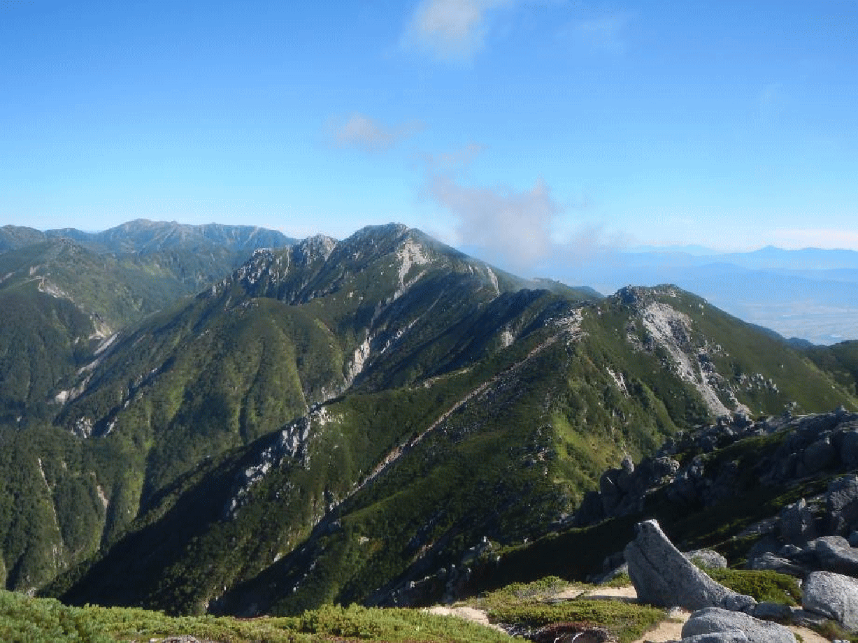 縦走路に入ると登山者の数も減る。途中、登り返した南駒ヶ岳からの展望も素晴らしい。深田久弥が最後まで100名山選定で悩んだ山らしく貫禄十分の山だ。岩峰の仙涯嶺を越えると稜線の雰囲気がガラリと変わる。尾根は広くなり、緩やかに登り返すと越百山に着いた。越百はこすも≠ニ読む。多くの山を越えて行かないと着けないということからこの名前が付けられたということ。標高2613mのこんもりとした丸い山頂。越百山まで来ると標高も下がるので、アルペン的な山容でなくなり、樹木が深くなっていく。南アルプスはより近くになり、南アルプス連山の奥に富士山もくっきりと見えた。
