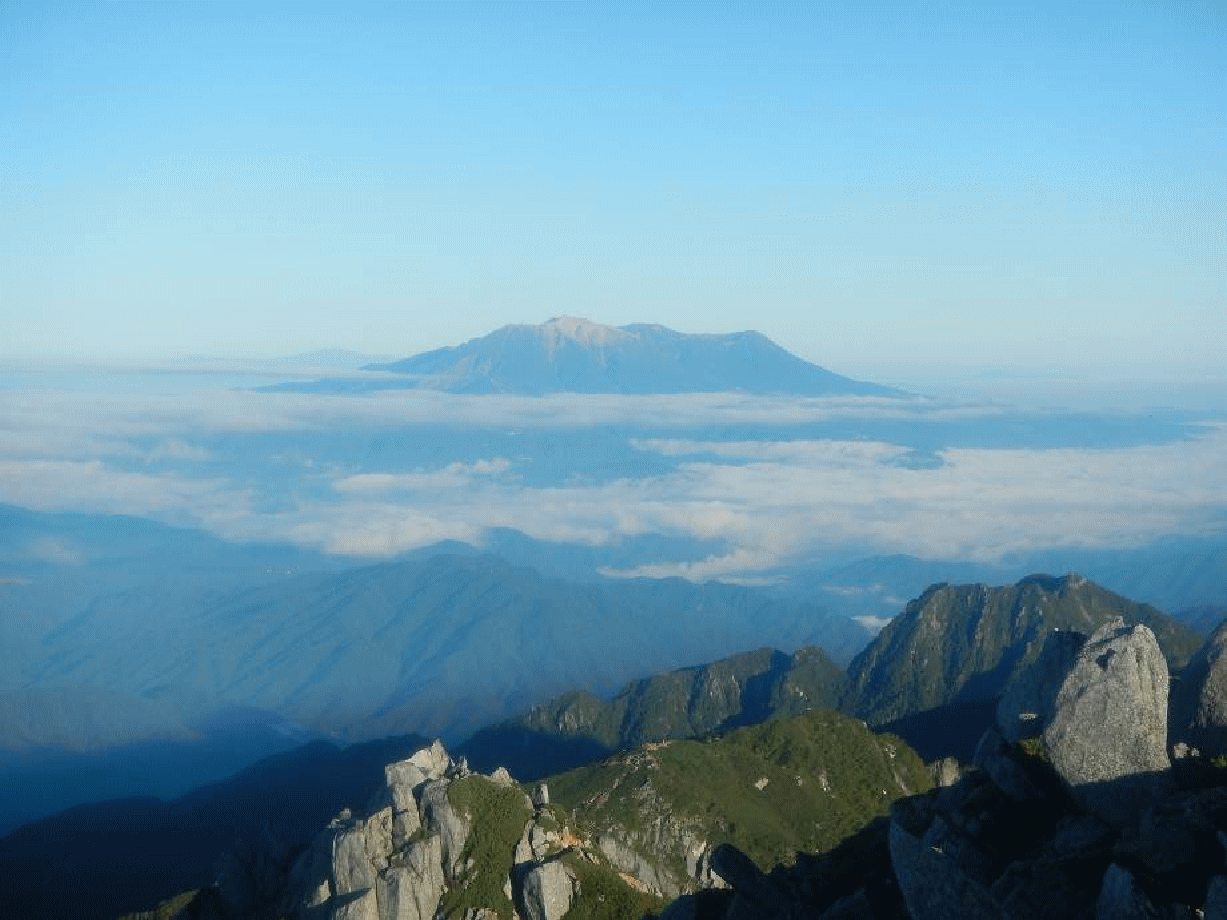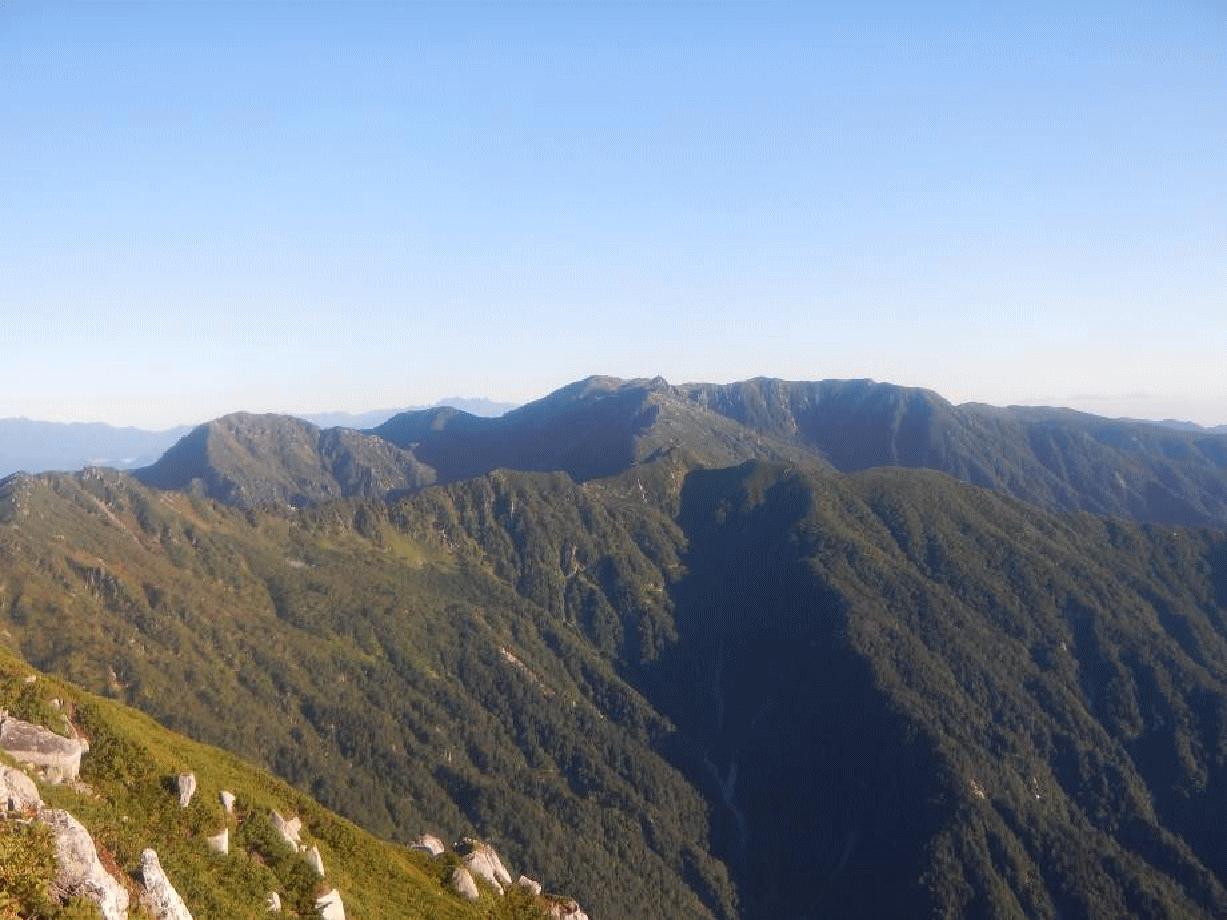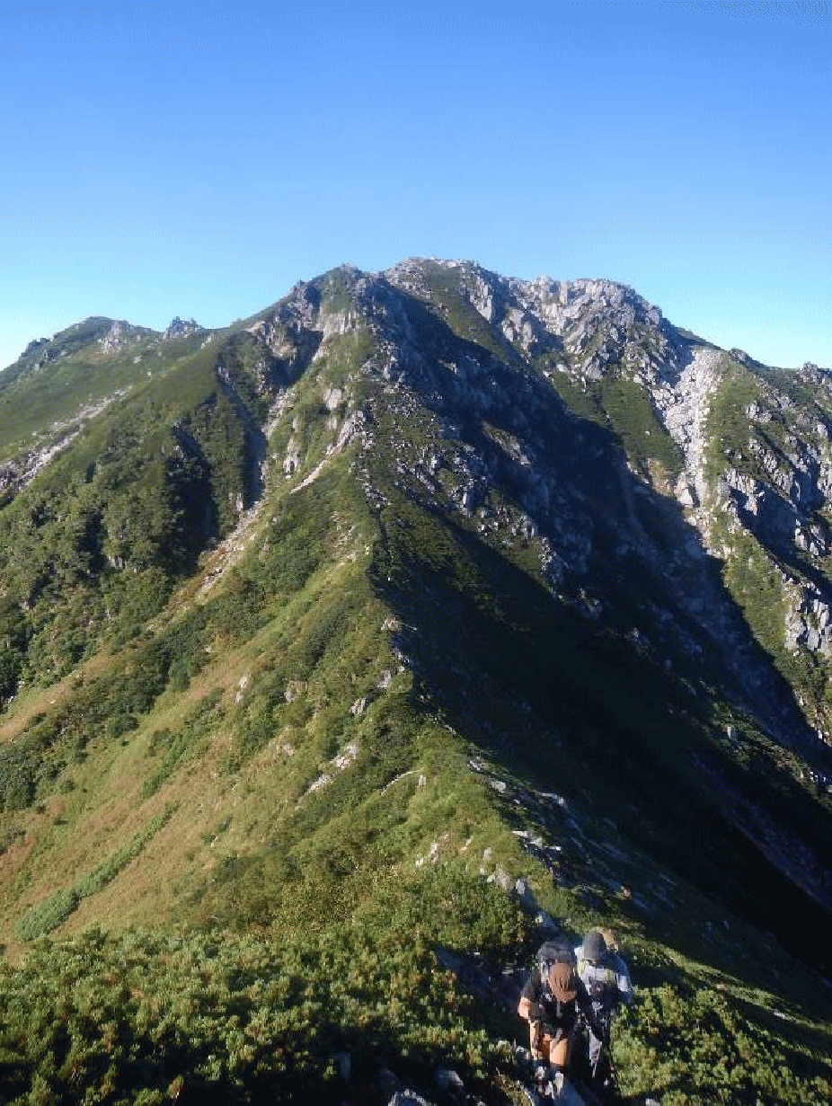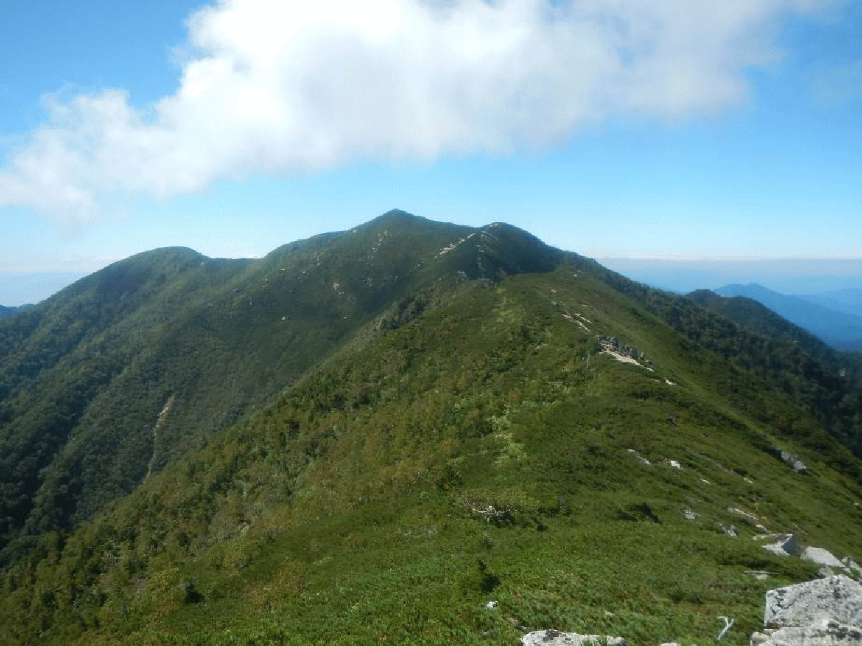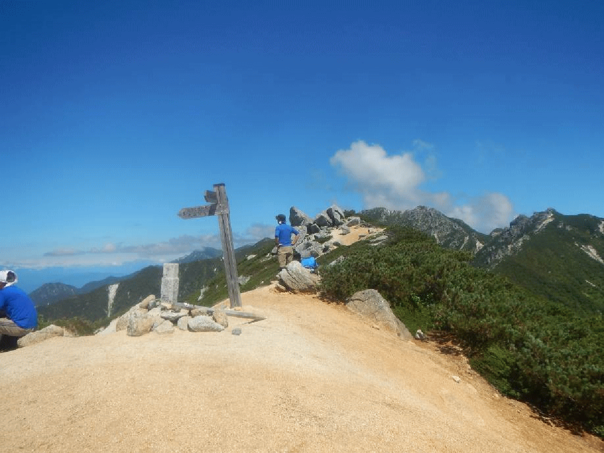 縦走路に入ると登山者の数も減る。途中、登り返した南駒ヶ岳からの展望も素晴らしい。深田久弥が最後まで100名山選定で悩んだ山らしく貫禄十分の山だ。岩峰の仙涯嶺を越えると稜線の雰囲気がガラリと変わる。尾根は広くなり、緩やかに登り返すと越百山に着いた。越百はこすも≠ニ読む。多くの山を越えて行かないと着けないということからこの名前が付けられたということ。標高2613mのこんもりとした丸い山頂。越百山まで来ると標高も下がるので、アルペン的な山容でなくなり、樹木が深くなっていく。南アルプスはより近くになり、南アルプス連山の奥に富士山もくっきりと見えた。