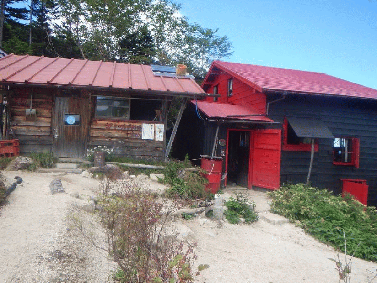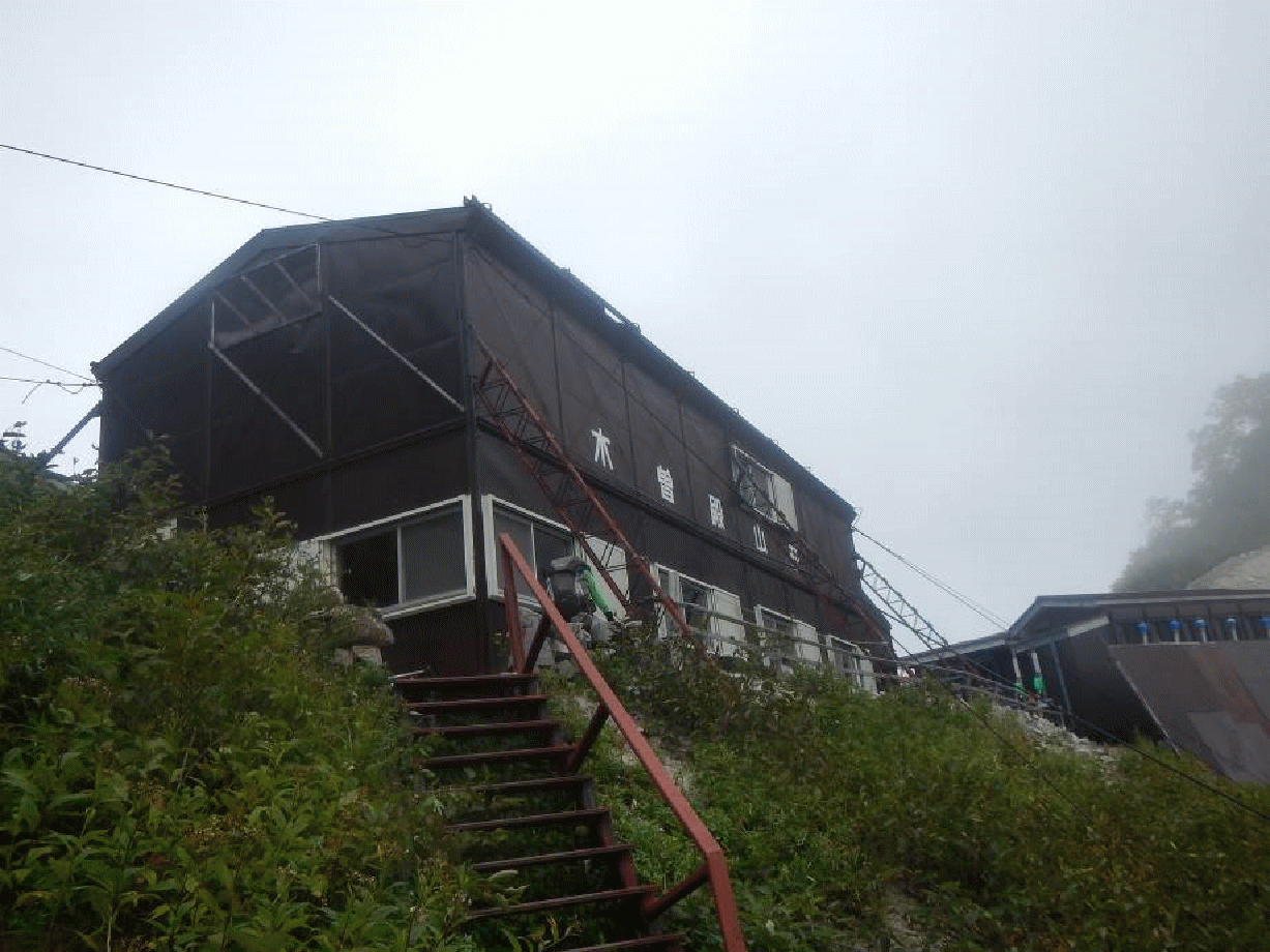 初日は曇り空。駐車場までは途中の崖崩れで入れず、ダム手前のゲートから歩く。林道を2時間強歩いたうさぎ平から山道となる。登山道はいったん沢に下り吊橋を渡ると樹林帯の中急登が続くが、7合目に「仙人の泉」、小屋手前に「義仲の力水」という水場もあり、登山道も歩きやすかった。曇りがちな一日で上部はガスの中を歩いたが、夕方頃には日差しが差し込む。木曽殿山荘は解放感ある山小屋で、快適な夜を過ごすことができた。