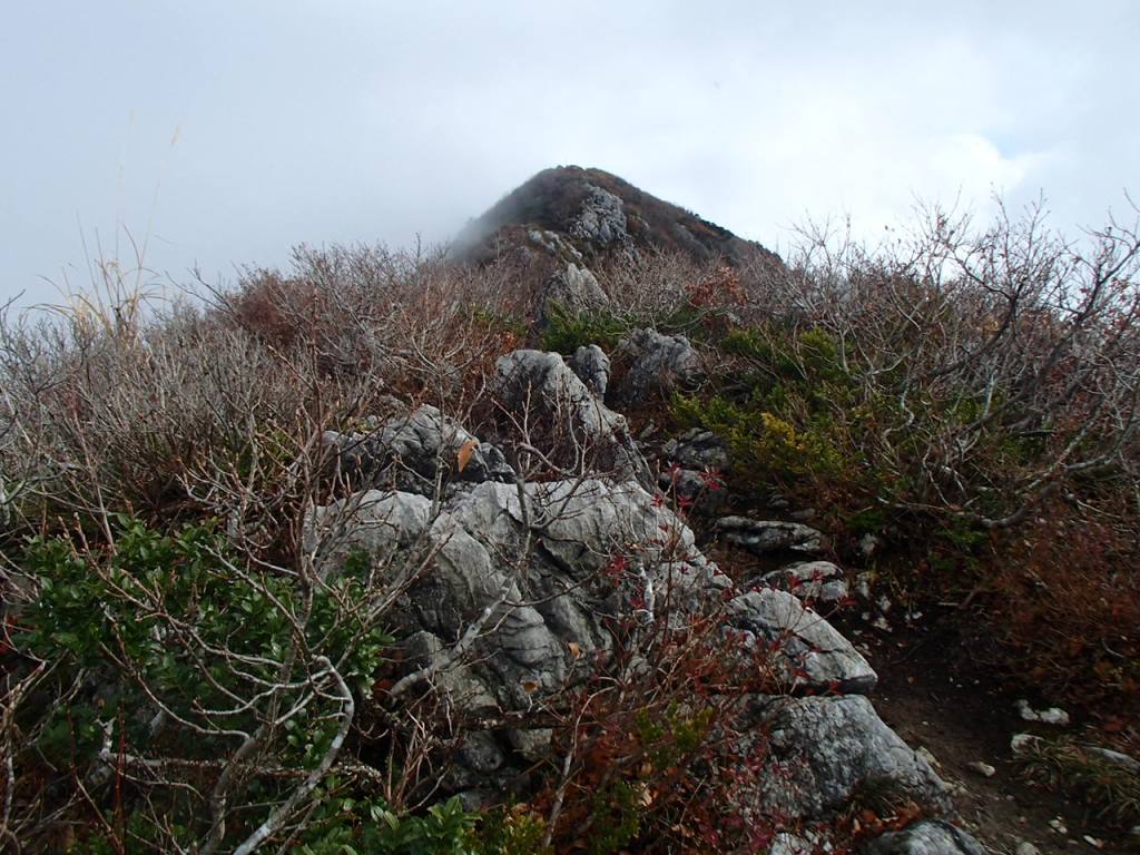 やっとの思いで頂上の末端稜線に出た。一気に景色が開け、石灰岩のギザギザの岩の稜線の先に山頂が見えた。すばらしい。暑い中、我慢に我慢を重ねた後に、冷たいビールを飲むような快感である。