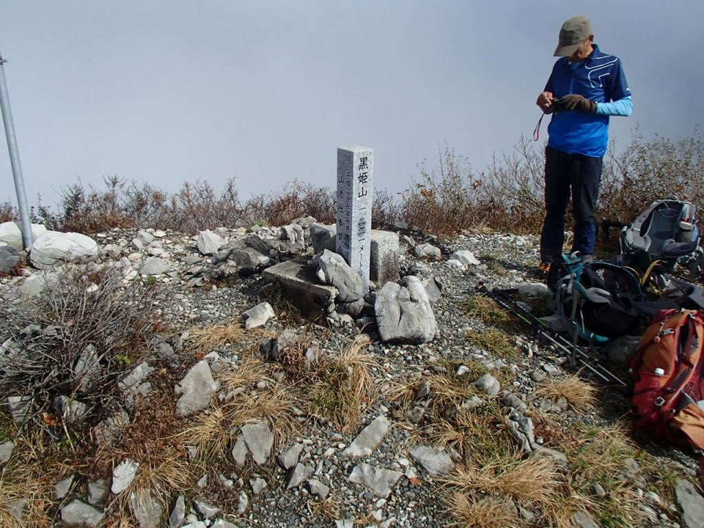 石川のパーティに少し遅れて山頂に到着。互いに写真を撮り合ったりして、昼食タイムとする。雲が多く展望は今一であったが、苦労の後のビールと昼食は美味しく、1時間程至福の時を過ごし満足して山頂を後にした。