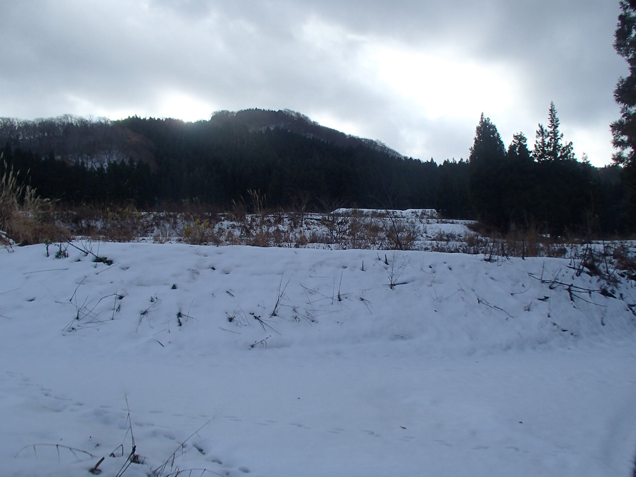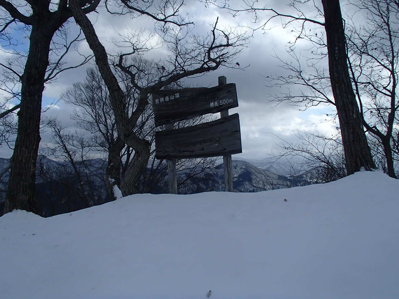 バスが中で回転するのでどこでも良いということではないらしいが、そこならOKと了解をもらう。境内にある看板をみて登りは鳥坂コース、下りは牛の首コースの周回をとることとして出発する。集落の中を少し歩き、続く林道を登って行くと登山道の分岐に着く。今日はこの吉祥嶽の他に天蓋山も登る予定意だ。登山道をぐんぐん登っていく。少しだった雪も登るにつれて多くなっていく。意外なほどの急坂を登って山頂に到着。登山口から45分、満願寺からだと1時間程であった。山頂でぐるりと景色を見渡したあと牛の首コースを下る。が、これが間違いであった。途中から道に迷ったが下山を強行し、結局行けなくなり、藪尾根を一時間登り返して山頂に戻るはめとなった。お手軽山のつもりが、かなりハードな山行となる。時間もかかり、疲れたので天蓋山はパス。近くの芭蕉公園でテントを張り昼食休憩として本日は終了。