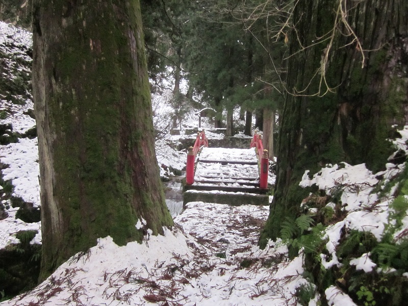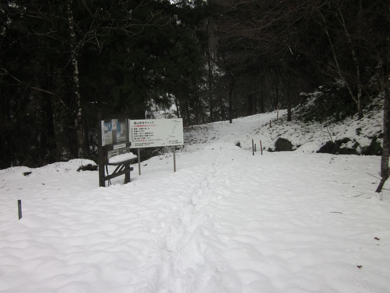 車道に雪が多くなったので橋を渡っり上がった田んぼの脇に止めて、ここから登ることに・・・30分で登山口に着く。