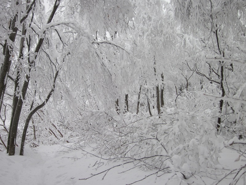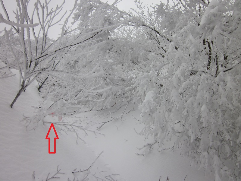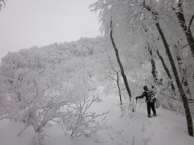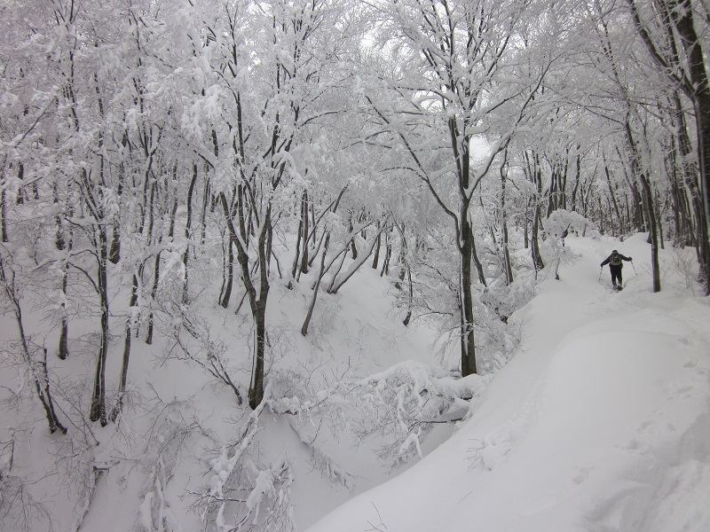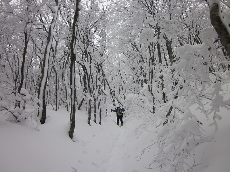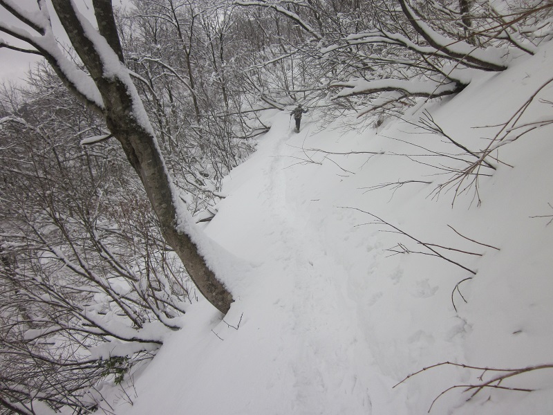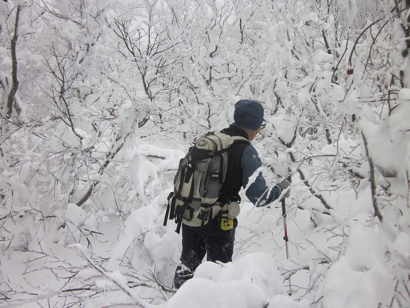私もT氏の後を追い、雪の重みで垂れた木々の間をかいくぐり道なき道を進む。T氏の足跡を頼りに頑張るが、和かんが新雪のサラサラした