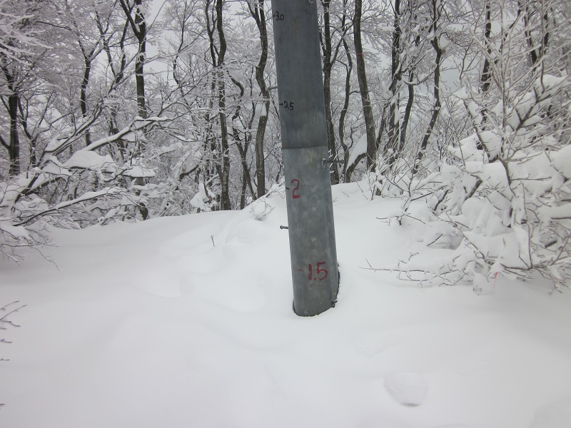 景色に見とれながら進み五合目に到着。1m30㎝位雪に埋まっている柱を写真に収めた。