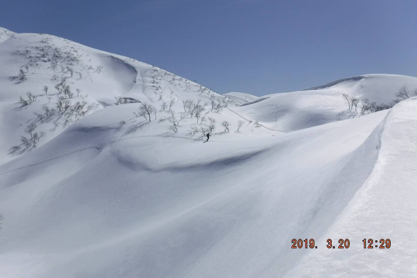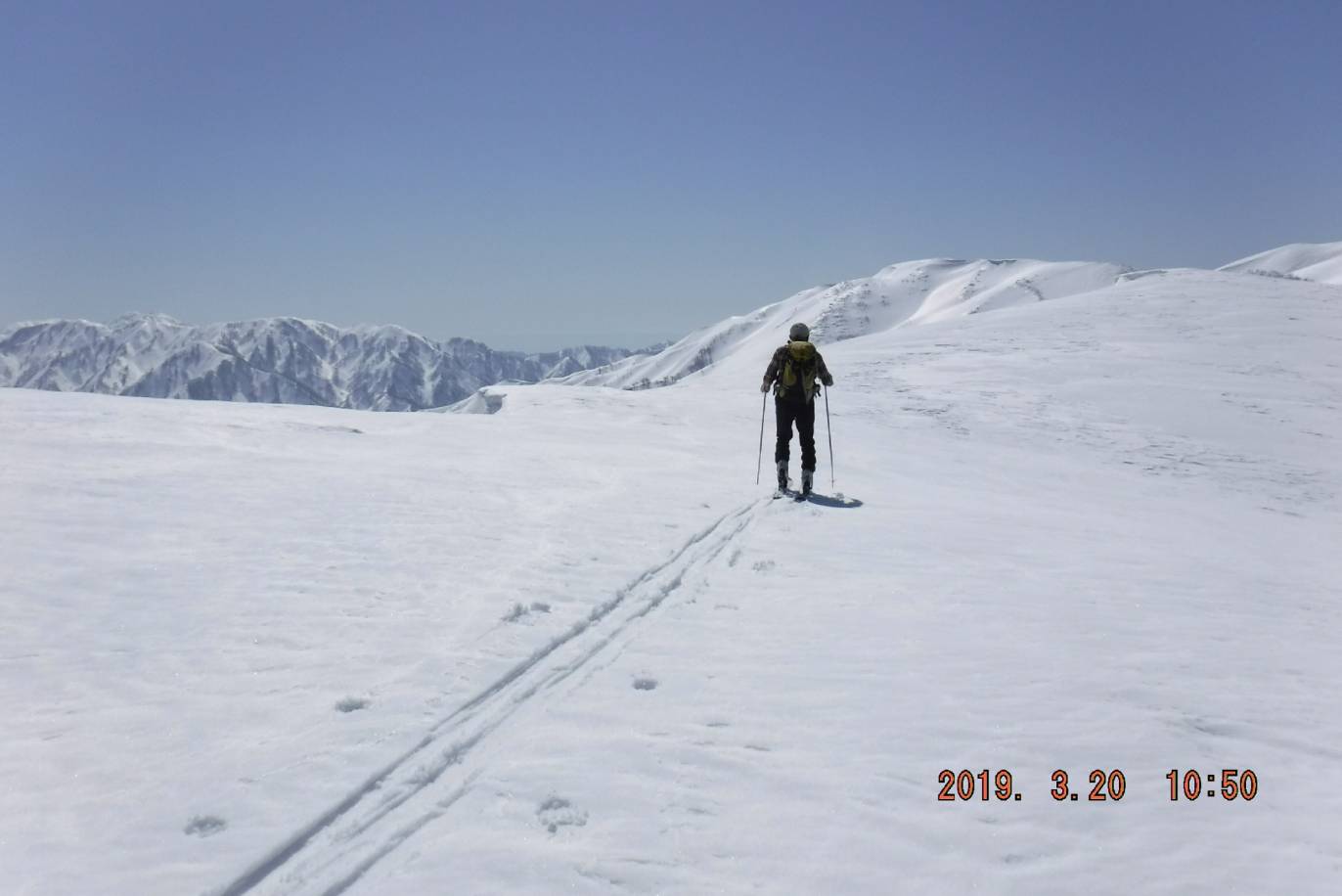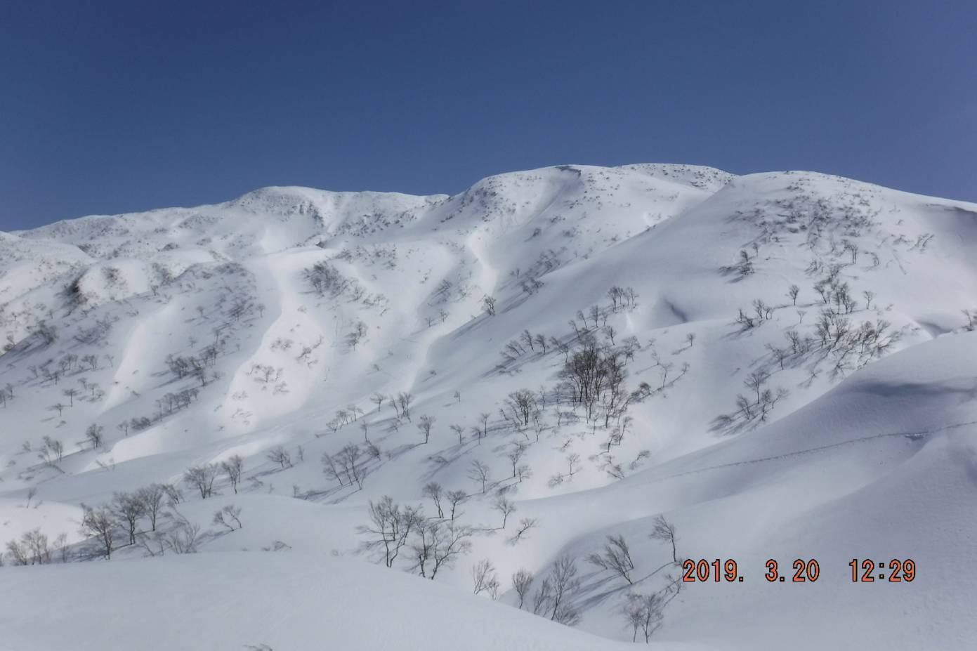 リフト終点まで綺麗に整備されたコース内を登る、今日は気温が高いのかシールの効きが良い。リフト終点からはトレースが無く今シーズン我々が一番乗りかも、上に行くに従い雪も多く昨シーズンよりも多く感じられた。低潅木帯に入り緩やかに登っていくと左方向に杁差岳や鋒立峰がせまってくる右方向には二王子岳頂上と広大な山襞、パートナーからは鼻歌が聞こえてくる。主稜線にでると二王子岳頂上まで白銀の飯豊連峰を見ながら稜線漫歩が続く。