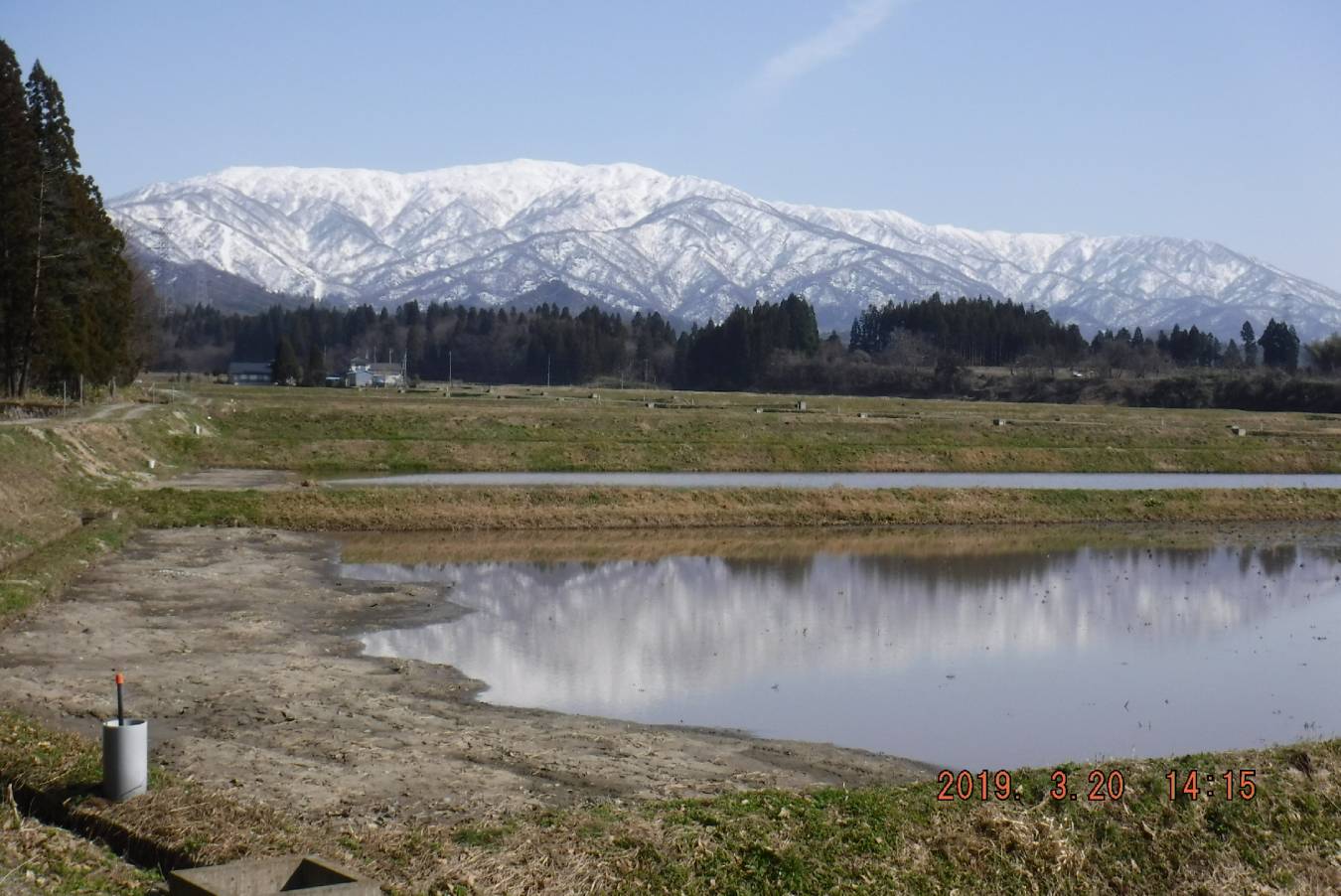 頂上小屋で休憩と滑降準備、三王子の先から夏道の尾根を外れ北側の沢に滑り込むが三日前の日曜に雪が降ったらしくモナカ状で滑り難かった。安全第一である。標高差約200mの滑降でシールを貼り少々登り返しワサビ沢への滑降ポイントへ移動する。ワサビ沢上部は急斜面で気温の上昇の為かいたる所でスノーボールが発生していた。下るに従い重い雪で息が切れる。滝を右側へ巻き滑りさらに広々とした斜面を滑ると右岸へ渡るポイントになる。ここから斜滑降で出合まで行くが雪は重く、やわらかく、崩れやすく、左側の沢底まで急傾斜で油断できない。本流の渡渉をすませばスキー場はすぐである。帰路、麓の蔵光集落のはずれの水芭蕉群生地を訪ね田んぼに映る二王子岳の全景に今年も来られたことに幸せを感じた。