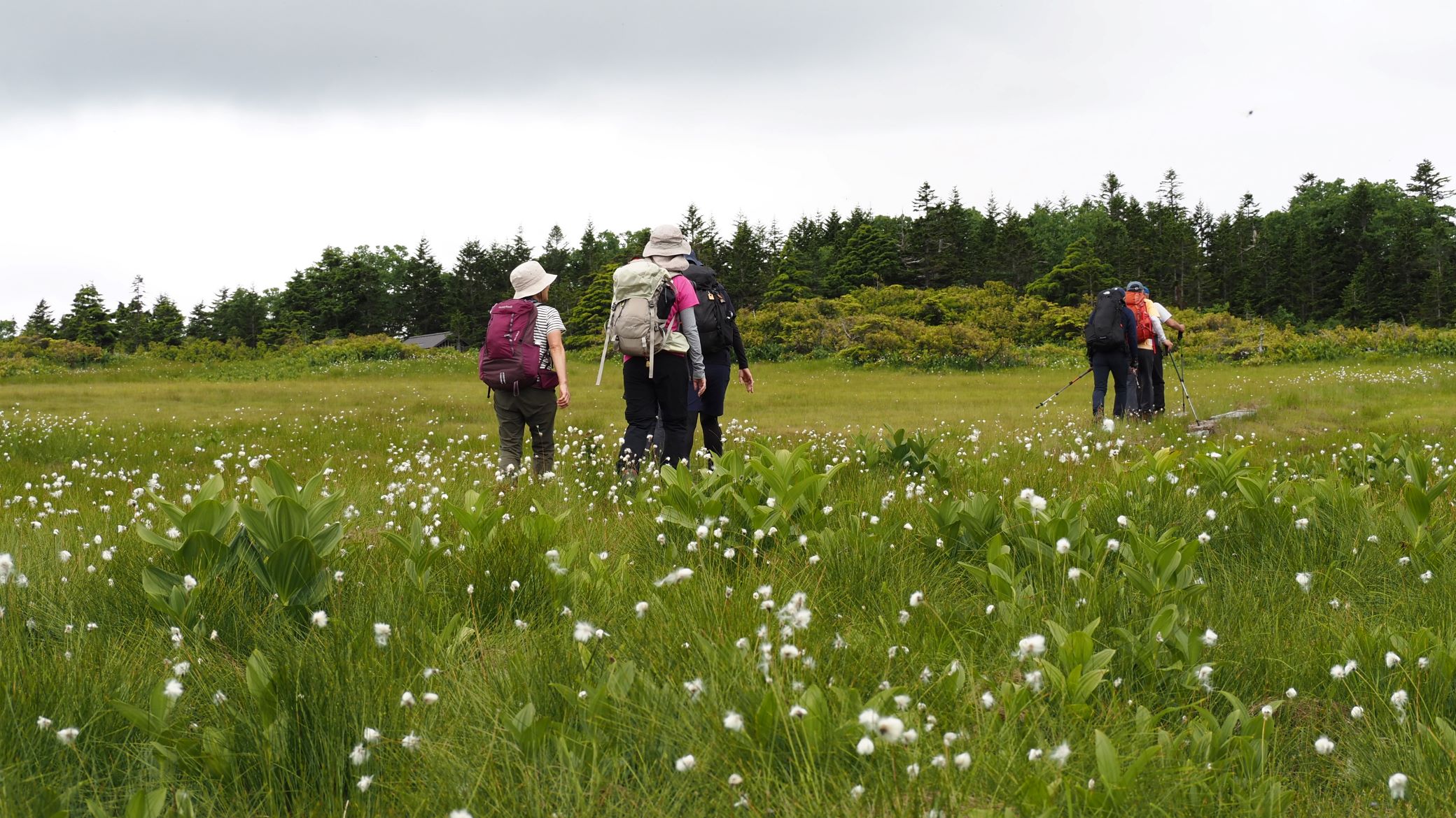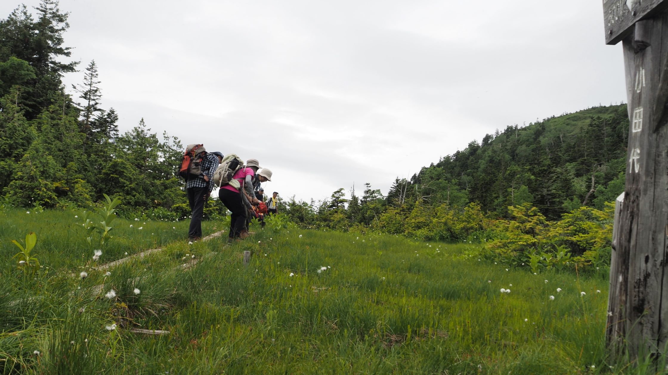この時期の湿原の主役はワタスゲ。木道の脇にワタスゲが多いのはなぜだろう。どこの湿原に行ってもそうだ。