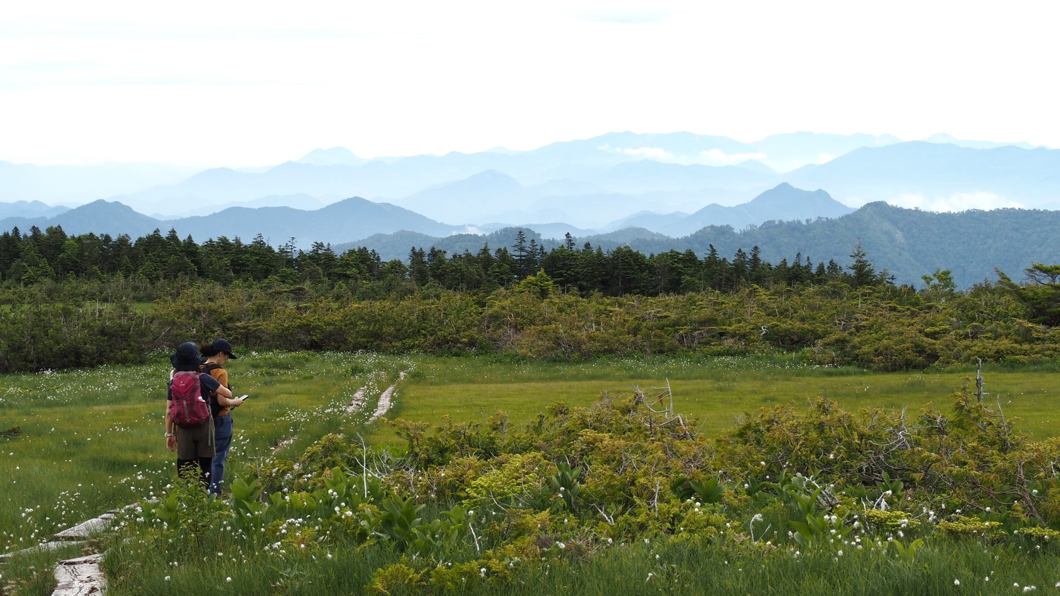 木道の先に幾重にも連なる山並み。どれひとつとして山名はわからない。