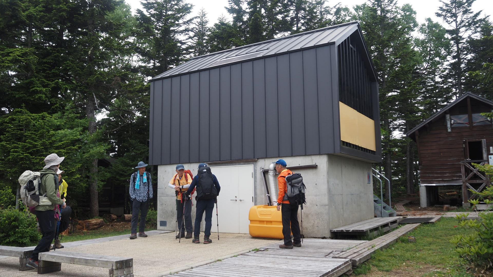 弘法大師堂に戻ってお昼。右奥がお堂で避難小屋を兼ねている。中は畳敷きになっていて快適そうに見えるが、弘法大師の座像に見つめられながら寝るのはちょっと・・という感じ。大きな建物は新しいトイレで中は土足禁止となっていてとてもきれい。少し雨がパラついたがすぐに止んだ。