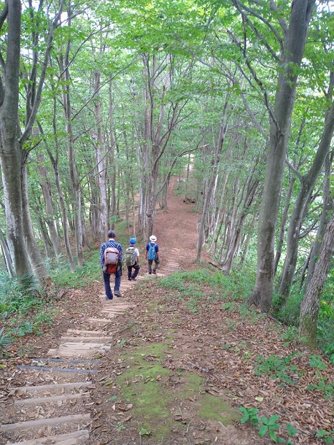 → 12:00標高320m地点のあずまや広場で休憩(~13:00) → 13:50ブナ林側の登山口到着 → 車道を歩き 14:20駐車場着
