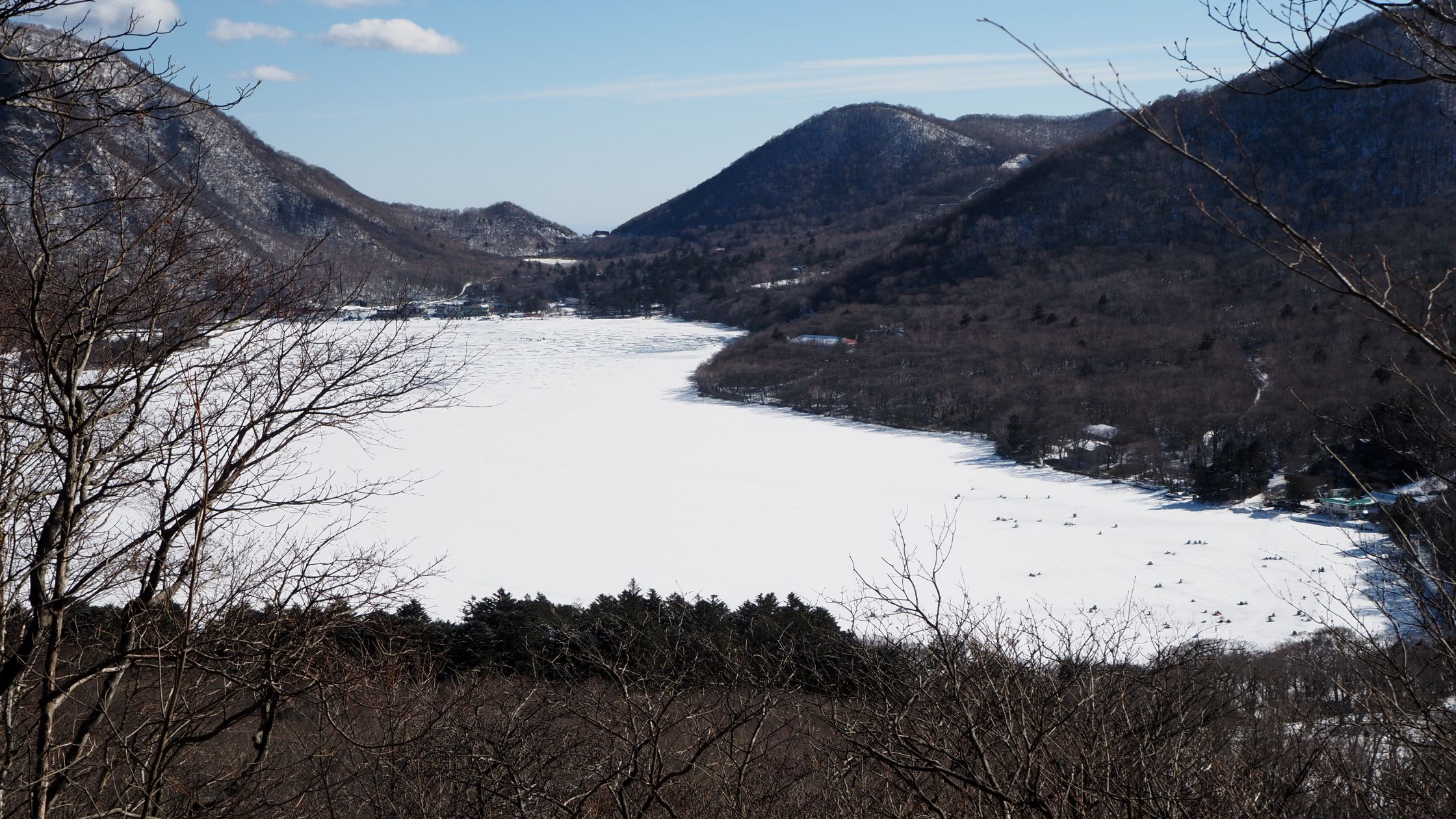 出張峠方向に下ると展望が開けて大沼が見えた。氷上のワカサギ釣りも見える。これでようやく赤城山に来たと実感できたので来た道を戻った。