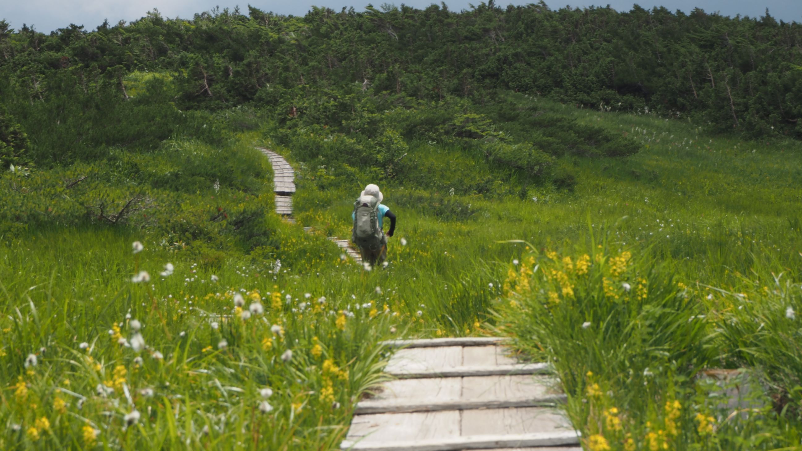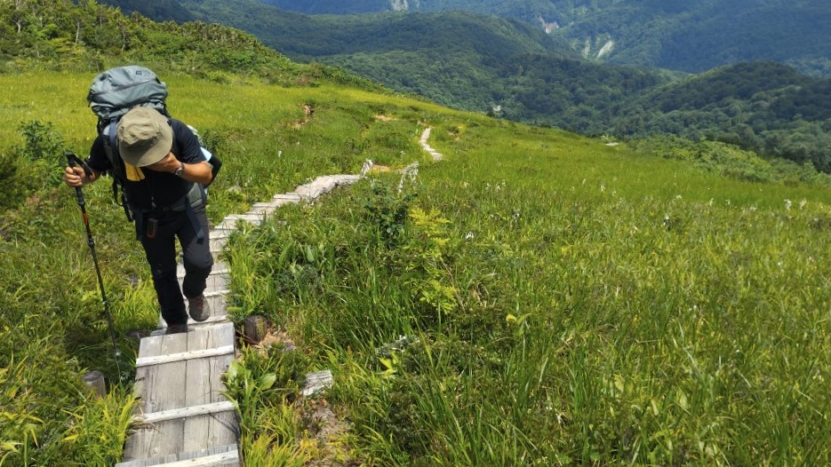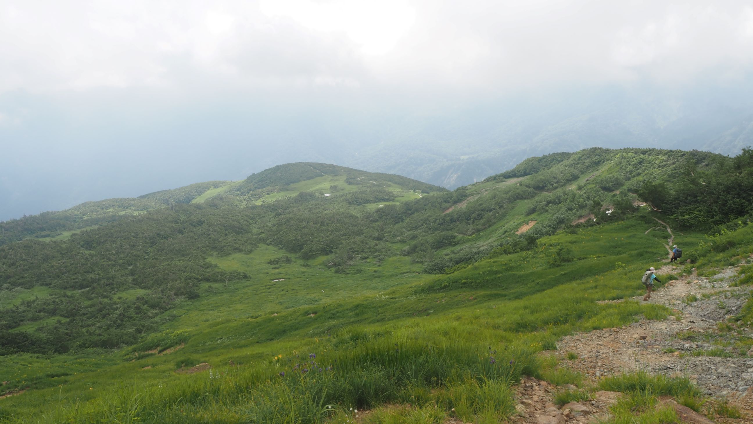 カモシカ坂の蒸し暑い樹林帯の急登は長く厳しい。そこから解放されると五輪高原の大草原が広がる。写真は標高1700m付近