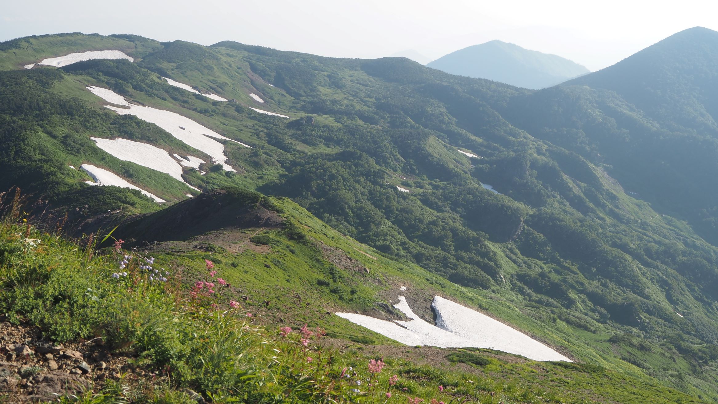 朝日岳の下降路から北側の展望。この山腹をずっとトラバース気味に歩いてきた。左から長栂山、黒負山(奥)、五輪山。