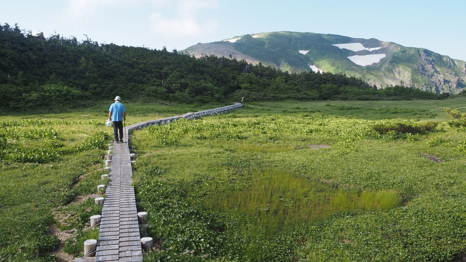 照葉の池の湿原と朝日岳。山も雨不足のようで湿原も乾きぎみ。