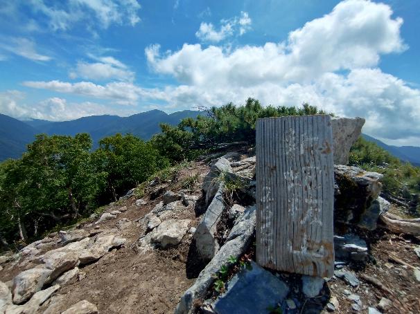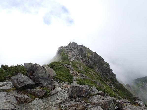 2日目は歩き始めはガスの中。塩見岳までは500メートルほどの登りとなる。塩見小屋まではアップダウンが多い樹林帯の中の道だが、小屋から山頂は岩稜帯の急登となる。山々のガスはなかなか晴れてくれず、塩見岳山頂での展望は得られなく残念。