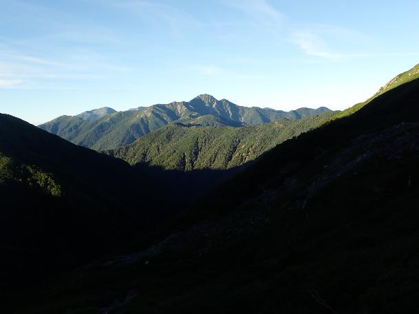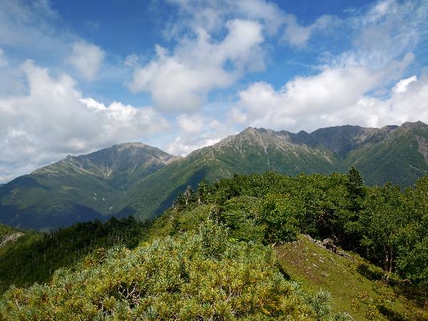 塩見岳と北荒川岳の標高差は約400メートル。ここまで下ると、あとはアップダウンを繰り返しながら熊の平小屋まで行くことになる。樹林帯の中の短調な道が続く中、展望が開けると、縦走のごほうびをもらったみたいでうれしい。