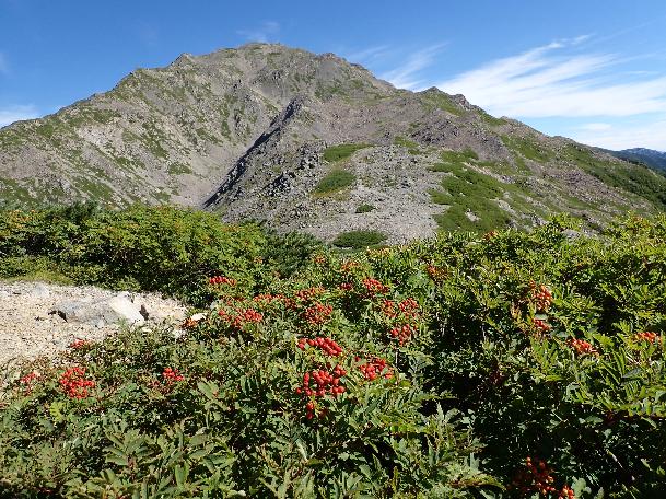 山頂を後にし、北俣岳分岐を過ぎると仙塩尾根となる。稜線直下のザレた急斜面ははい松帯にトラバース道が付けられている。下り切り、ダケカンバの草原を過ぎると北荒川岳の山頂だ。大好きな山頂。ここから見る塩見岳は圧巻の眺めだが、ガスはすっきりと晴れてくれない。