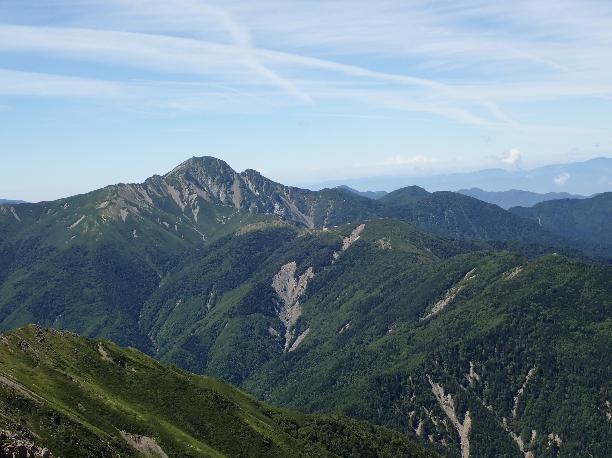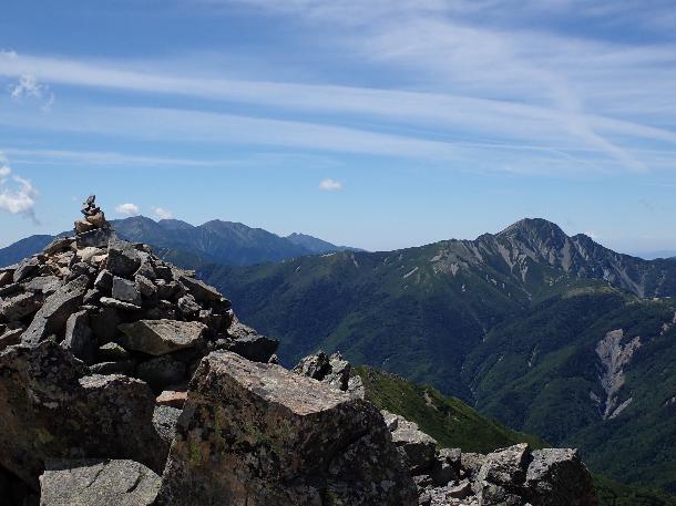 10農鳥岳から見た塩見岳。右奥が荒川三山」