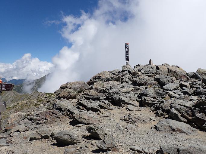 北岳山荘まで下ってくると雲が湧き始める。中白根山を越えて間ノ岳に着くころには高い山々は雲に覆われてしまい、間ノ岳からの展望は得られなかった。