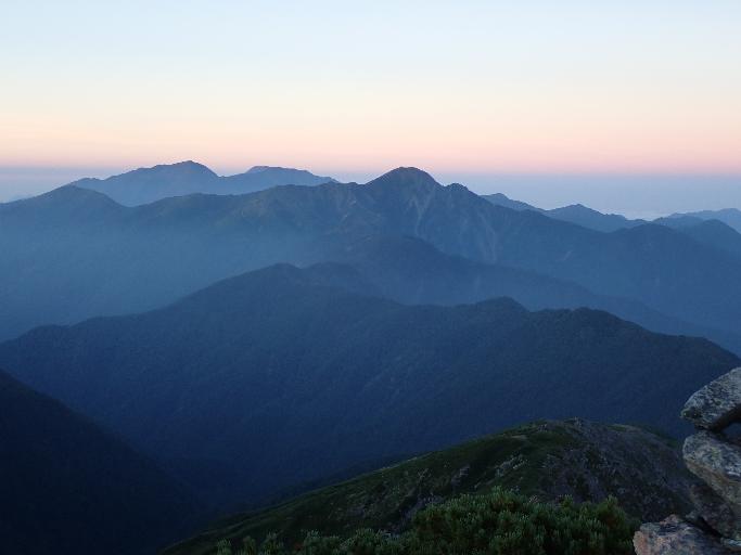 11「三峰岳の夜明け。塩見岳からの仙塩尾根。奥は荒川三山」