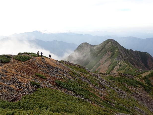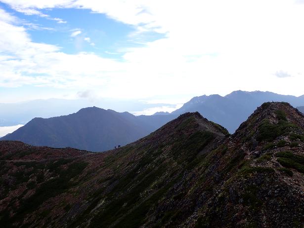 翌日は明るくなってから歩き出す。天気は回復してきており、仙丈ヶ岳山頂からは展望を楽しむことができた。