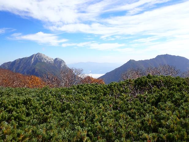 <10/12>曇り→晴れ 馬の背ヒュッテ6:00 - 仙丈ヶ岳7:30 - 仙丈小屋8:40