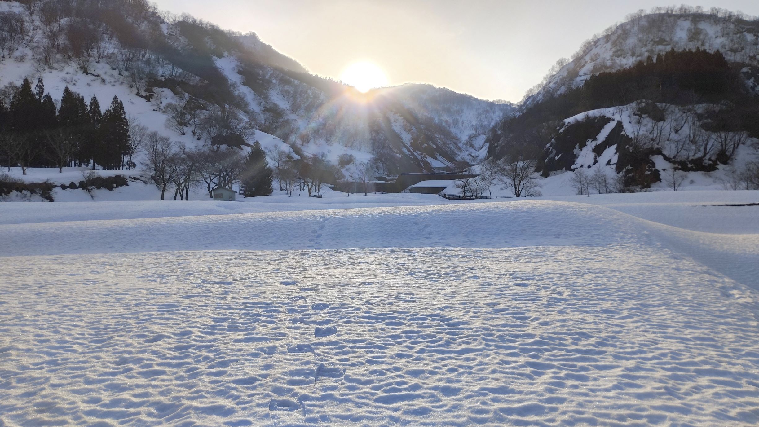 田んぼの上を歩き始めると谷間にもようやく朝日が差してきた。
