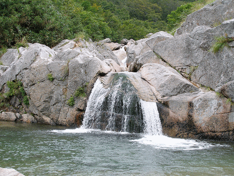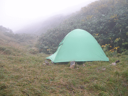 二股近くになってくると、傾斜も強くなってくる。天気もガス+霧雨となっていた。二股の右俣上に良いテン場があったが、私たちは右俣をつめ源頭の草地まで行く。沢が細くなり左に曲がるところの草原でテントを張ることにした。ザイルは使わず終い。天気も悪かったせいか、ナメ滝のスケール、深い釜の美しさがあまり伝わってこなかった、というのが実感だった。