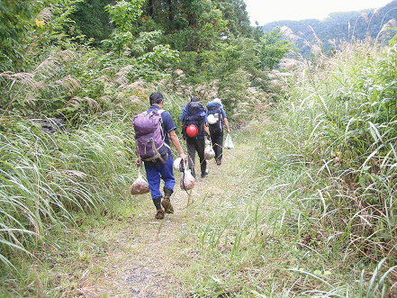 道は大石沢出合から沢沿いにいく。昨日遡行した沢だ。道は長靴が大正解、泥のぬかるみがひどい。キノコに目を光らせながら歩く。ふと脇の大きな倒木に目をやると、どしゃ〜〜ん!!とナラタケがたわわに付いている倒木だった。凄まじいという言葉が当てはまるくらいだ。ラッ〜キ〜〜!みんなで採っても大分時間がかかったほどの量である。それからブナハリも採れ始め、併せてものすごい量の収穫となった。