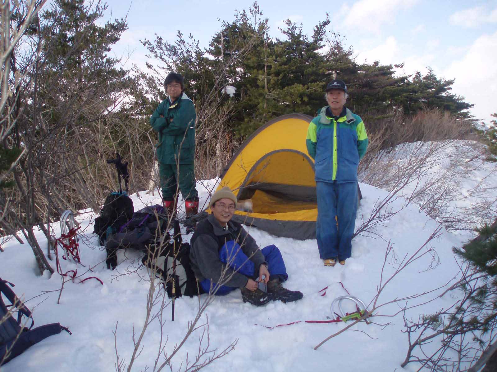 雪もだんだん深くなり、歩きにくくなったので途中F以外はワカンを装着する。Fはワカンをもってはいるが、ツボ足でがんばるようだ。上部は遠くから見た通り急登となり、枝につかまりながら登る。標高はあまり高くないのだが、思ったよりきつい山だ。