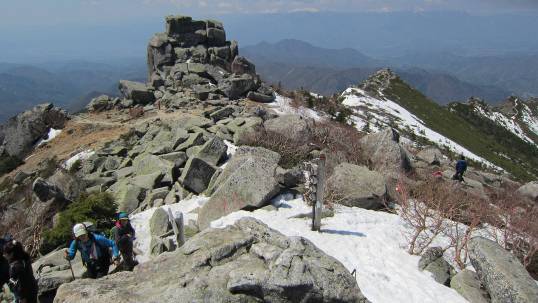 3時間半を要して、ようやく山頂に到着。やや霞みがかっているものの快晴で見晴らしも上々だ。昨日登った瑞牆山(ここから見るとちょっとミニサイズ)、八ヶ岳連峰、南アルプス、富士山(霞んで白っぽい)の景色が圧迫感のない距離で広がっている。いい景色だ。