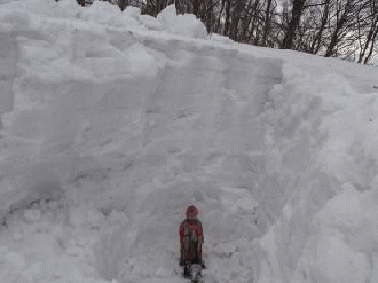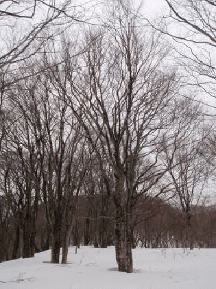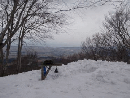 端正なブナの林の中、高坪山頂へは近かった。鐘が大分出ている。男性が来週の山開きのためにお地蔵様を掘り起こしていた。雪の高さは2メートル以上もあるだろうか。私が1ヶ月以上も前に付けた赤テープは上のほうで揺らめいているので、今冬の積雪は4メートル近くもあったのだろう。
