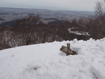 途中、立派な東屋が建っていたり、道標がしっかりと付けられている。分岐(高坪の分岐というらしい)から右廻りコースを行く。日当たりのよい急斜面には雪が解けているので、ワカンを付けたはいいが、歩きにくい。急斜面を登り切ると尾根上の道となり、荒川の運動公園からの道と合わさる蔵王分岐となった。