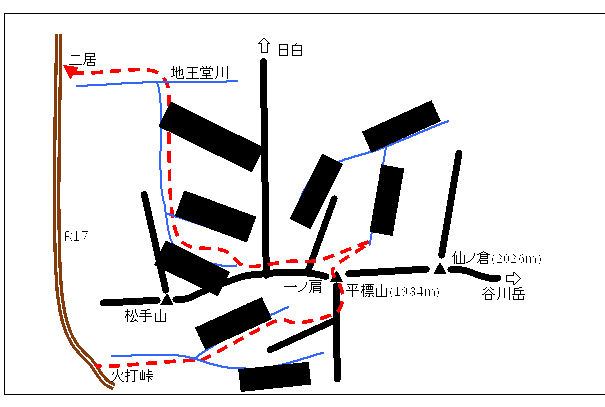 【時間記録】 火打峠07:50 − 平標山頂10:50 − 西ゼン1700m付近11:30 − センノ沢源頭ピーク12:45 − 地王堂川13:35〜14:20 − 二居バス停14:45