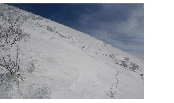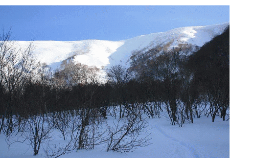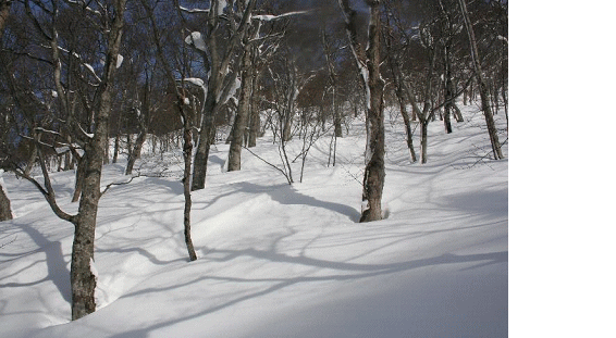 センノ沢左岸側の斜面は主にダケカンバと思われるが、こちらの斜面の方がスキーにはいいかもしれない。