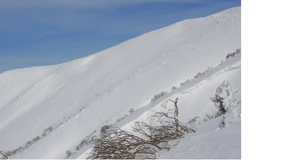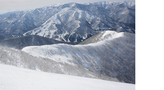 センノ沢源頭部は低木が雪上に出ているものの真っ白な斜面だ。源頭部から沢の中の状況が見えないので、センノ沢とツガノ沢の間の尾根を降りる。快適な斜面は間もなく終わり立木が濃くなってくる。ツガノ沢側はその名のとおりコメツガが多い。