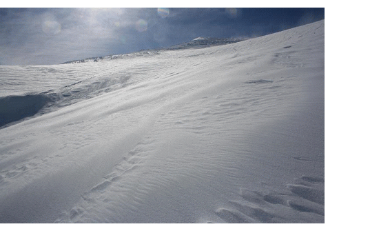 シールを付けたまま一ノ肩のコルに降り、さらに風下となる西ゼン側の窪地まで降りる。